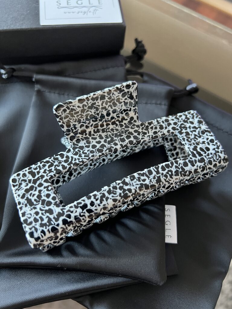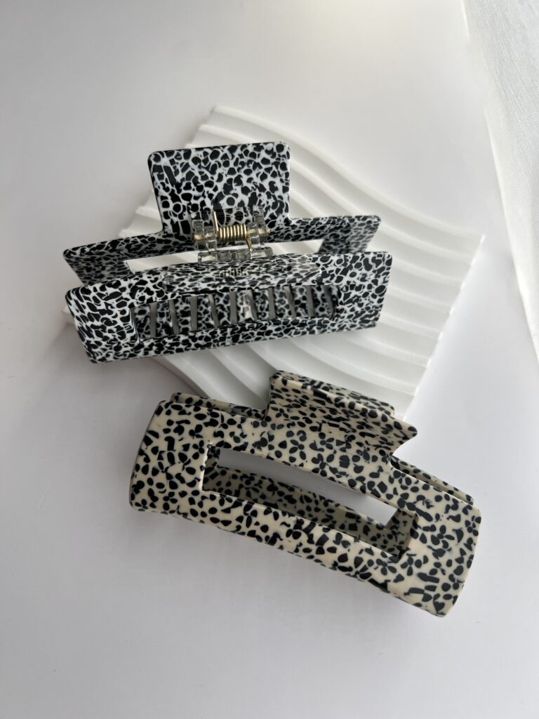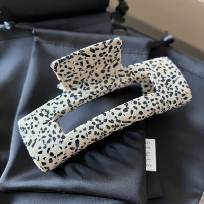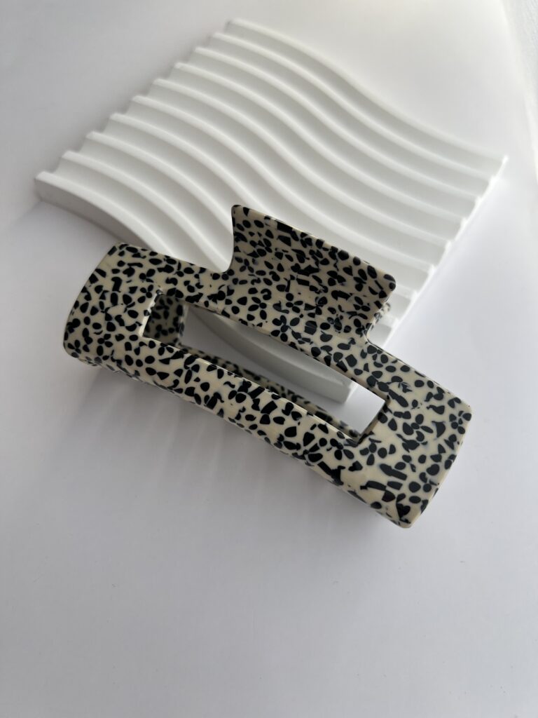 Plaukų segtukas – žnyplės „Aguona”, kreminės arba baltos spalvos su juodais taškeliais. Puošnus ir subtilus aksesuaras plaukams.
