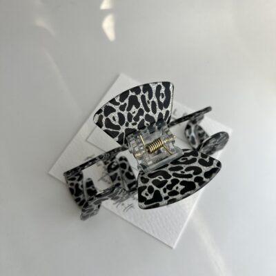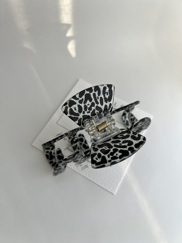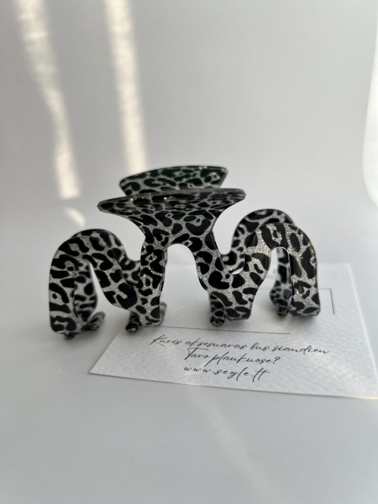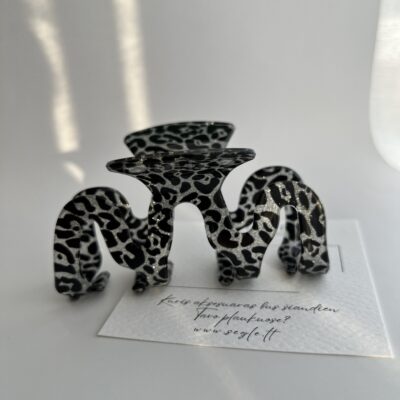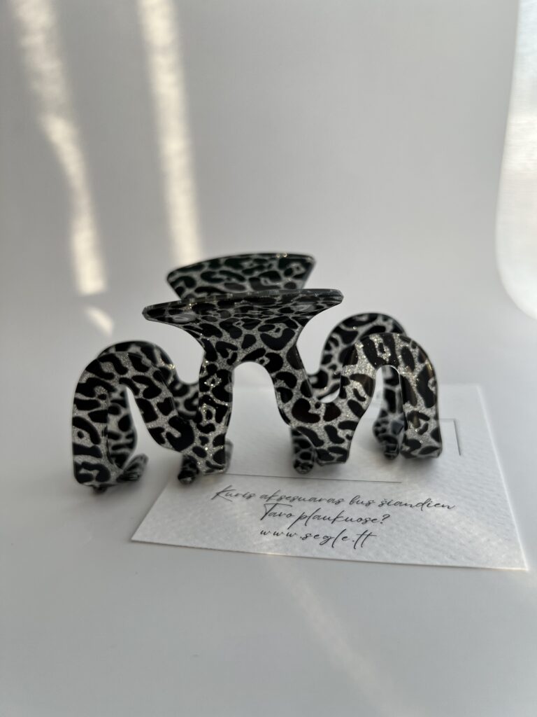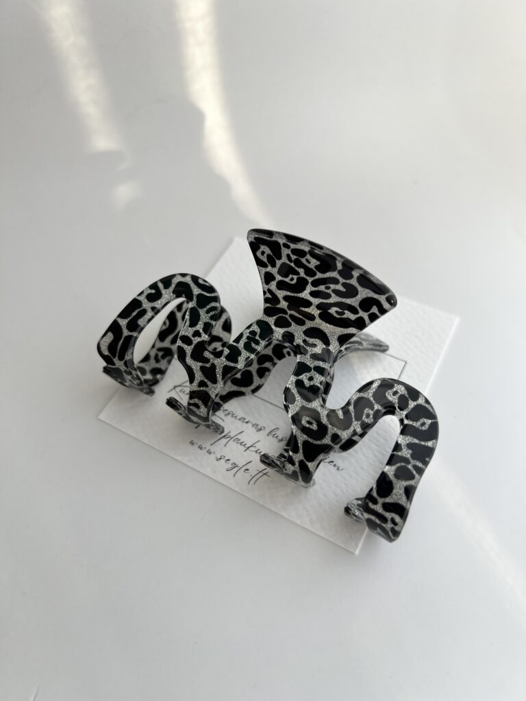 Plaukų segtukas bangelės formos, blizgios pilkos spalvos su juodais leopardiniais raštais.