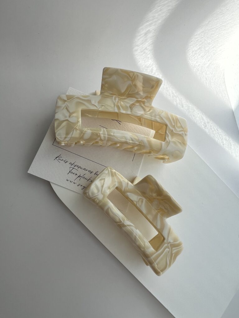 Plaukų segtukai žnyplės, kurių paviršius atrodo lyg išlieto balto šokolado. Segtukai šviesių spalvų – kreminės, gelsvos ir baltos. Tokios spalvos plaukų aksesuarai tiks šviesiaplaukėms ir tamsiaplaukėms.