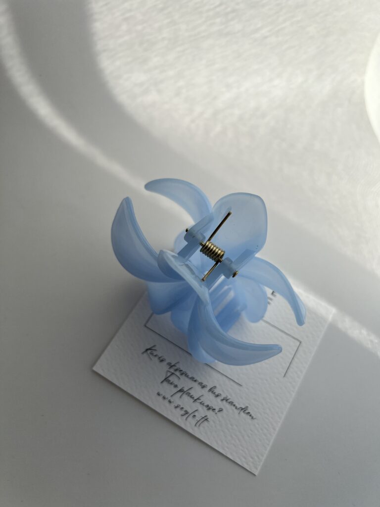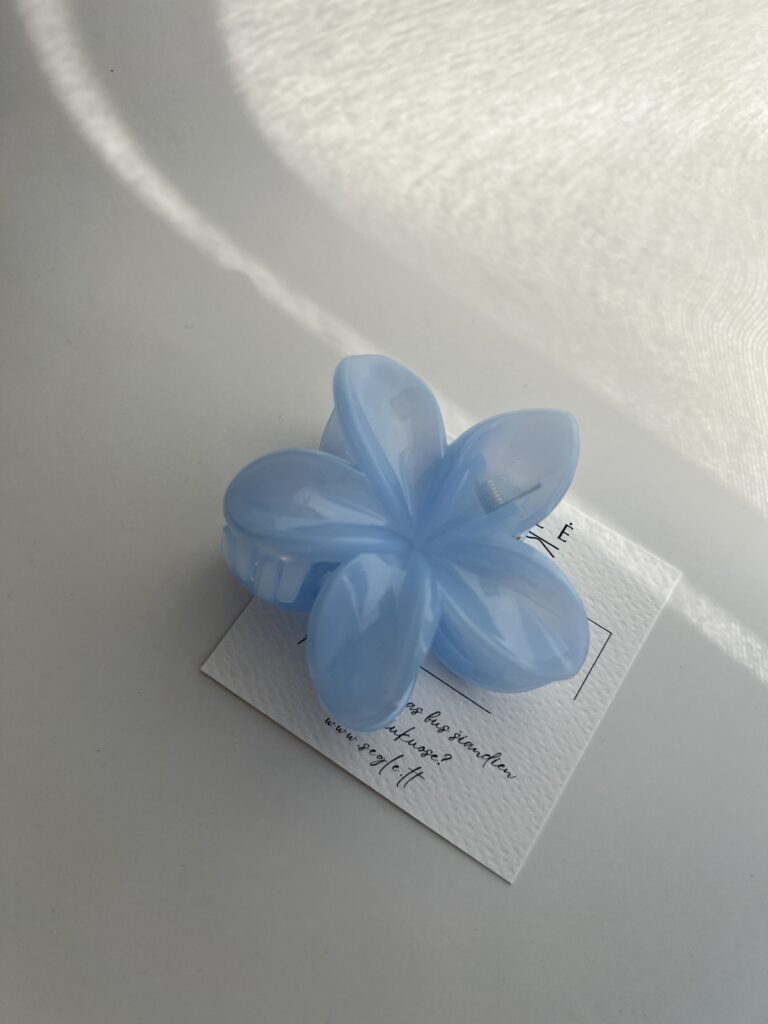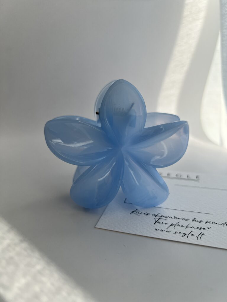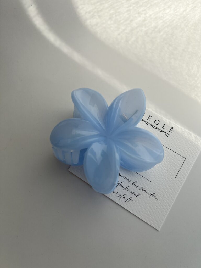 Šviesiai melsvos spalvos, gėlės formos plaukų segtukas žnyplės.