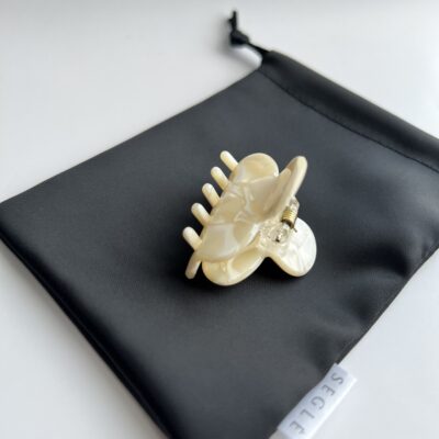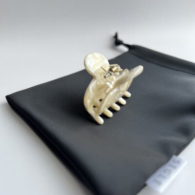 Nedidelis plaukų segtukas žnyplės kurio paviršius atrodo lyg išlietas baltas šokoladas.