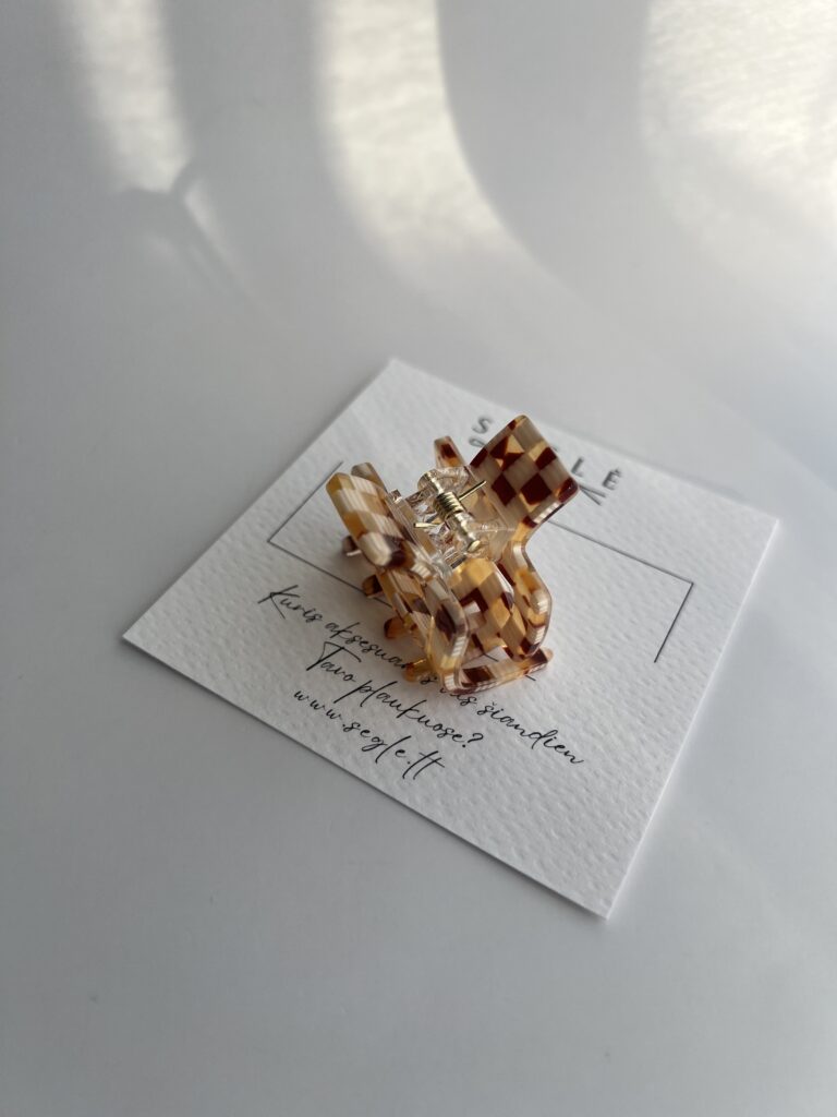 Plaukų segtukas nedidelis – 3,4cm. ilgio ir 1,5cm. pločio ir 3cm., aukščio.