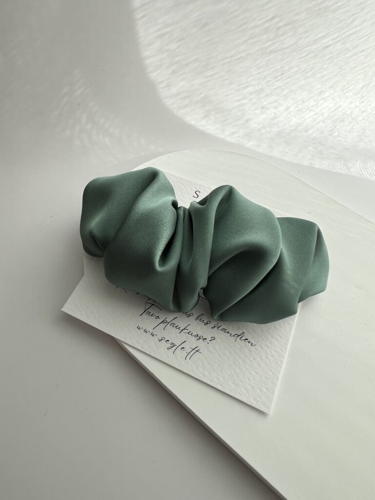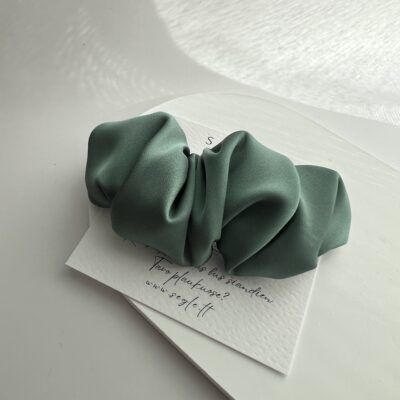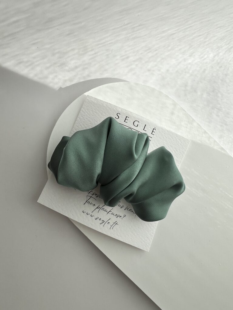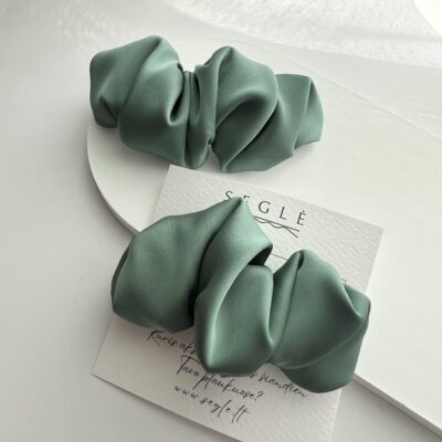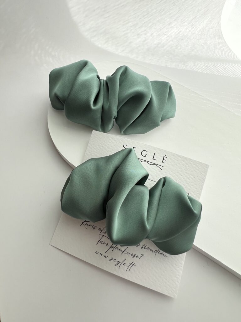 Rankų darbo plaukų segtukai pagaminti iš mineralinės žalios spalvos dirbtinio šilko audinio.