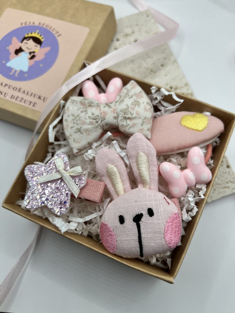 Rinkinyje rasite 4 vnt. plaukų segtukų, rausvą zuikį, segtuką su širdele, kaspinėlį ir segtuką žvaigždutę, bei dvi plaukų gumytes. Plaukų segtukai prilaikys plaukučių priekines sruogas, kad nekristų ant veiduko.