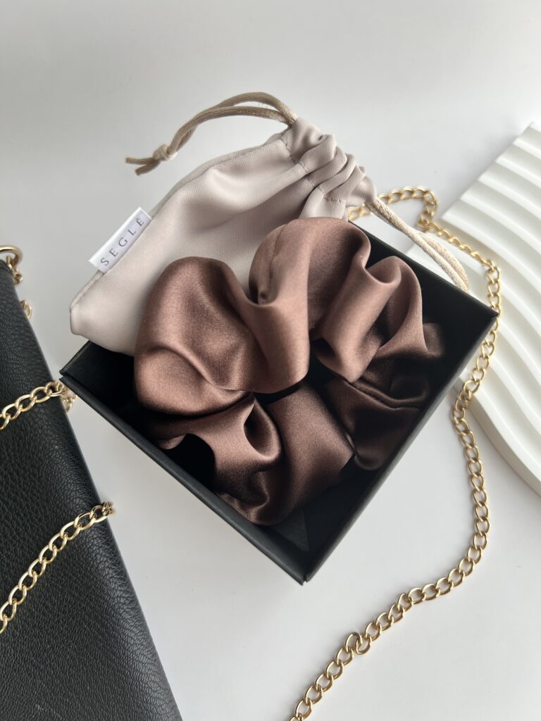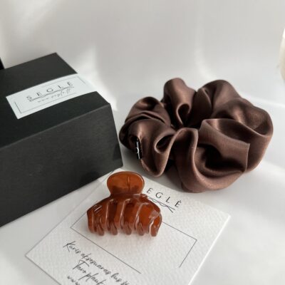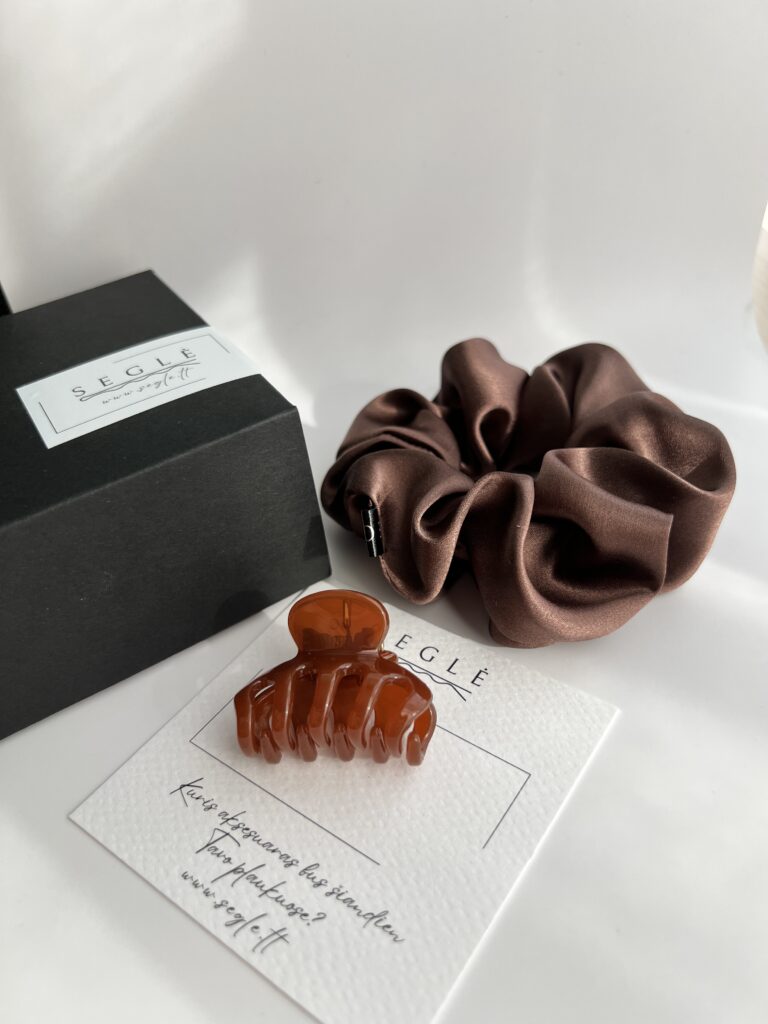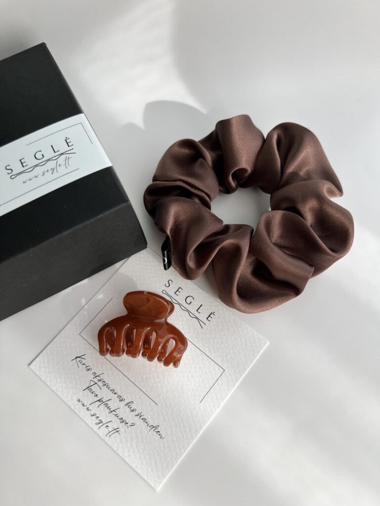 Rinkinyje rasite natūralaus šilko šokoladinės spalvos, vidutinio dydžio, rankų darbo plaukų gumytę ir nedidelį plaukų segtuką – žnyples.