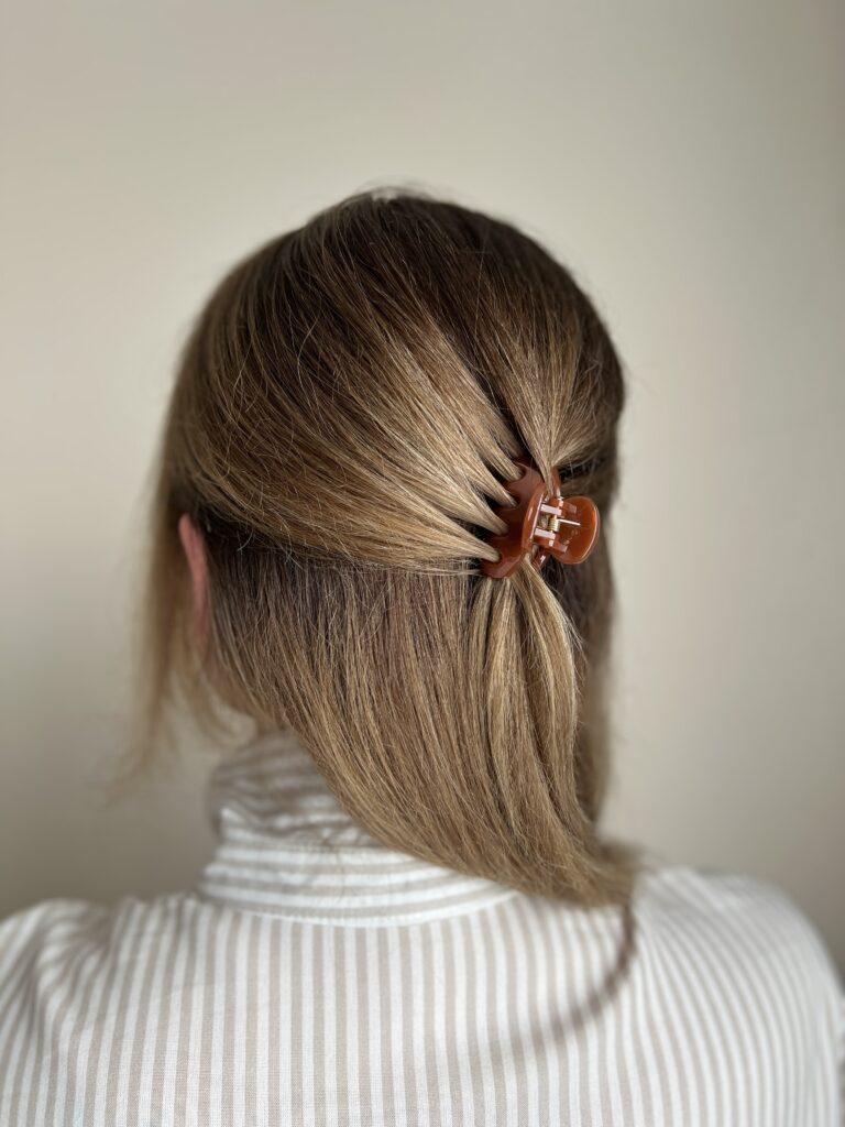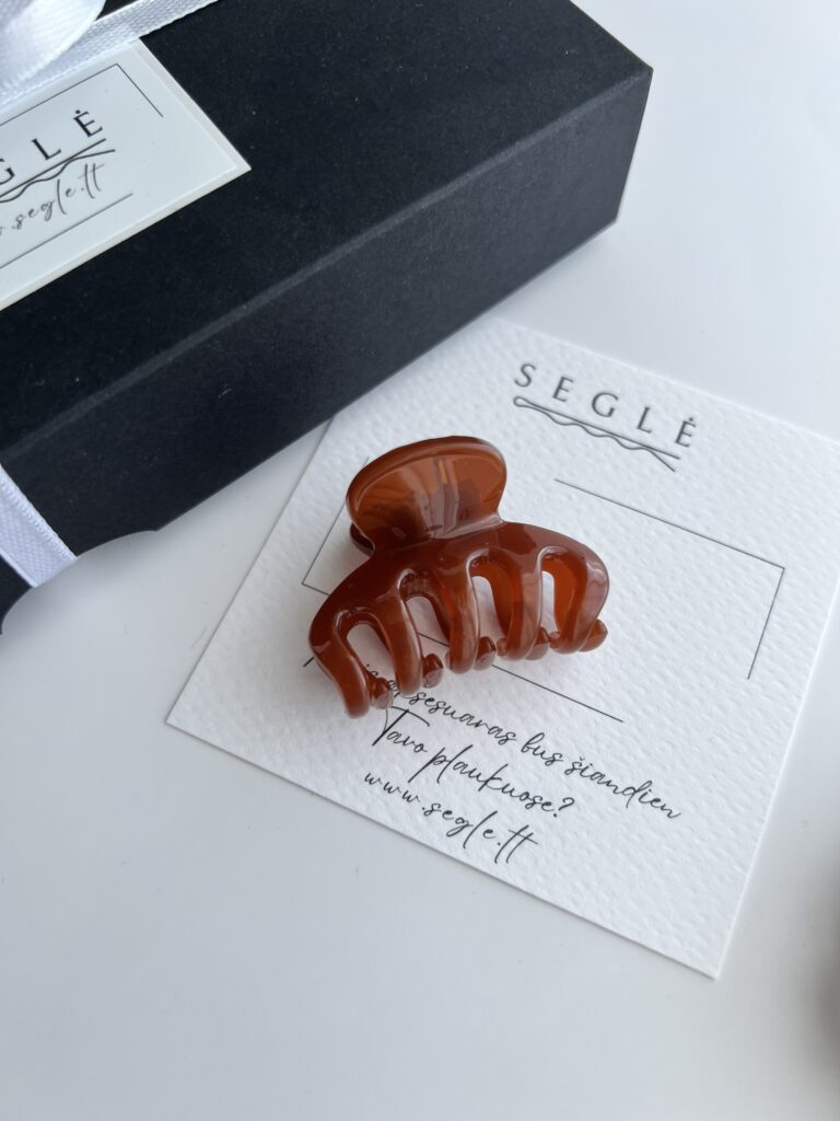 Nedidelis plaukų segtukas – žnyplės „Kava”, šviesios kavos spalvos. Segtukas tvirtai susega plaukus ir jų nelaužo. Tinka įvairaus ilgio ir storio plaukams. Su šiuo segtuku galima susegti dalį plaukų arba sutvirtinti mažus plaukų kuodelius, Segtuko ilgis 3,5cm., aukštis 2,5cm.