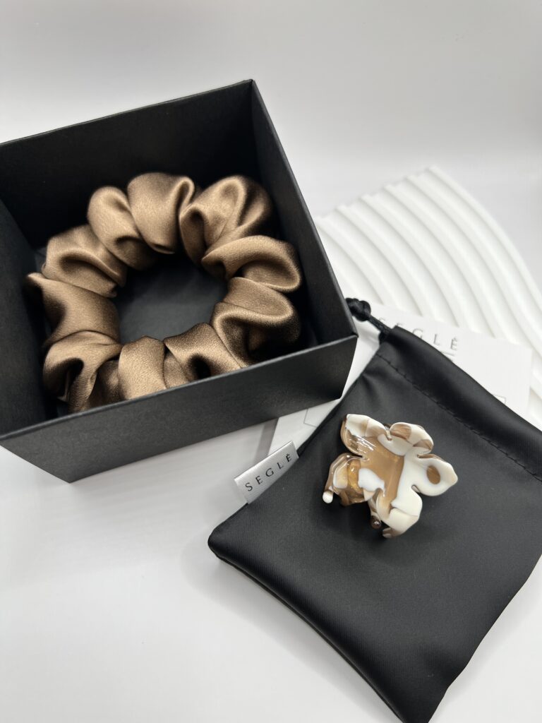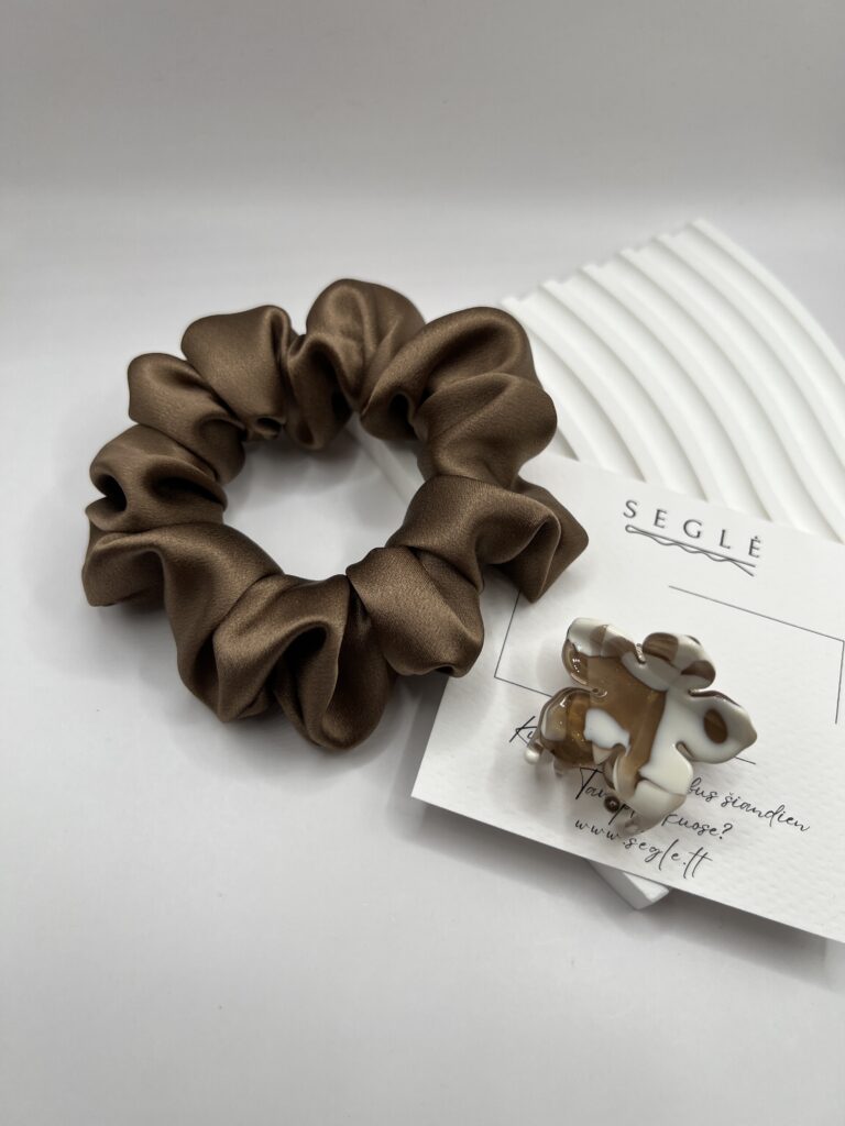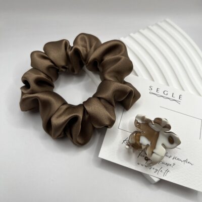 Rinkinyje rasite natūralaus šilko šviesaus pieniško šokolado spalvos rankų darbo plaukų gumytę ir nedidelį gėlės formos plaukų segtuką – žnyples.
