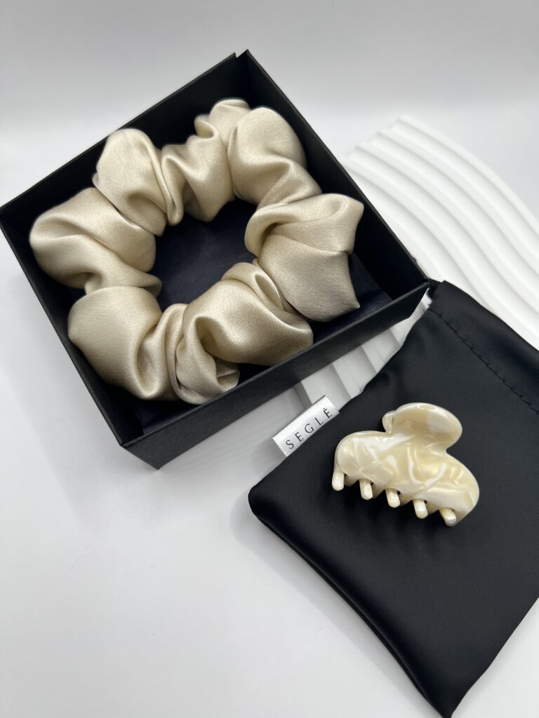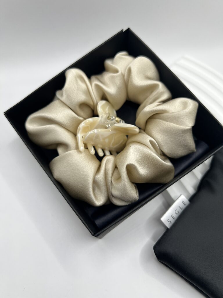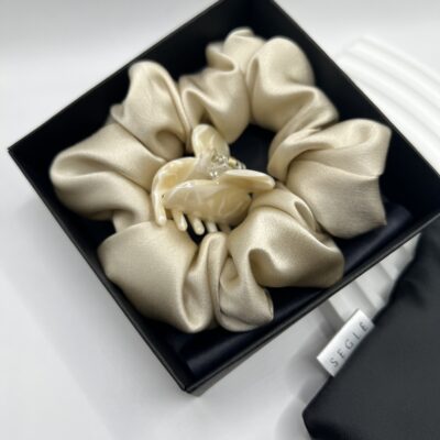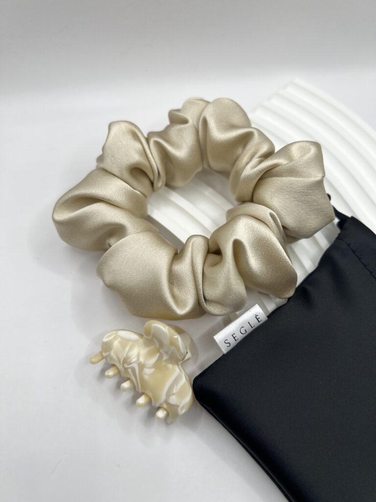 - Rankų darbo, natūralaus šilko, vidutinio dydžio šampaninės spalvos plaukų gumytė. Plaukų gumytė tvirtai suriš ir puoselės jūsų plaukus, pukiai tiks prie vasariško įvaizdžio. Aksesuaras pridės žavų akcentą įvaizdžiui. Šią plaukų gumytę galite nešioti ir ant rankos.