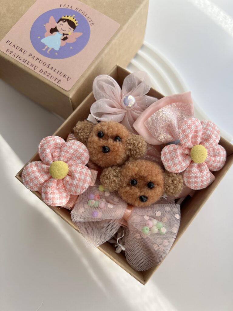 Rinkinyje rasite 10vnt. pastelinių rausvų spalvų plaukų segtukų su paminkštinimais ir plaukų gumytes su rudais šuniukais. Visi aksesuarai supakuoti dėžutėje su žaismingu fėjos lipduku. Dėžutės ilgis ir plotis 9,5 cm., aukštis 5 cm.. Tinka 3-4 metų mergaitėms.