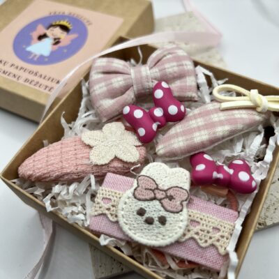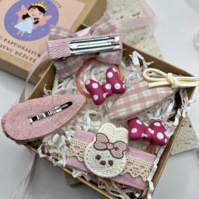 Rausvos spalvos plaukų segtukai ir gumytės mergaitėms rudoje dėžutėjePlaukų aksesuarų rinkinys mergaitėms „Zuikis”