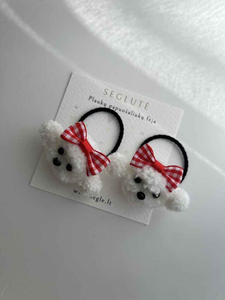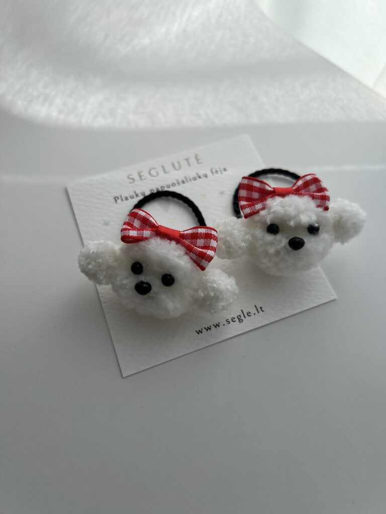 Žaismingos plaukų gumytės mergaitėms su baltais šuniukais.