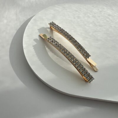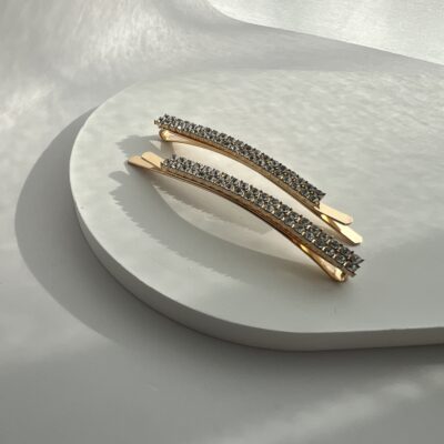 Metaliniai plaukų segtukai dekoruoti blizgančiais kristaliukais.