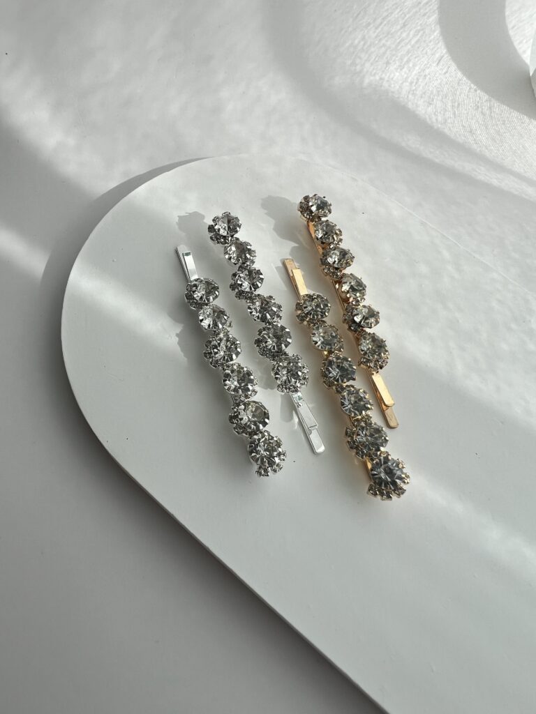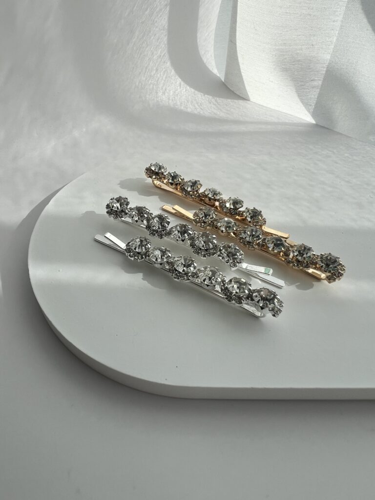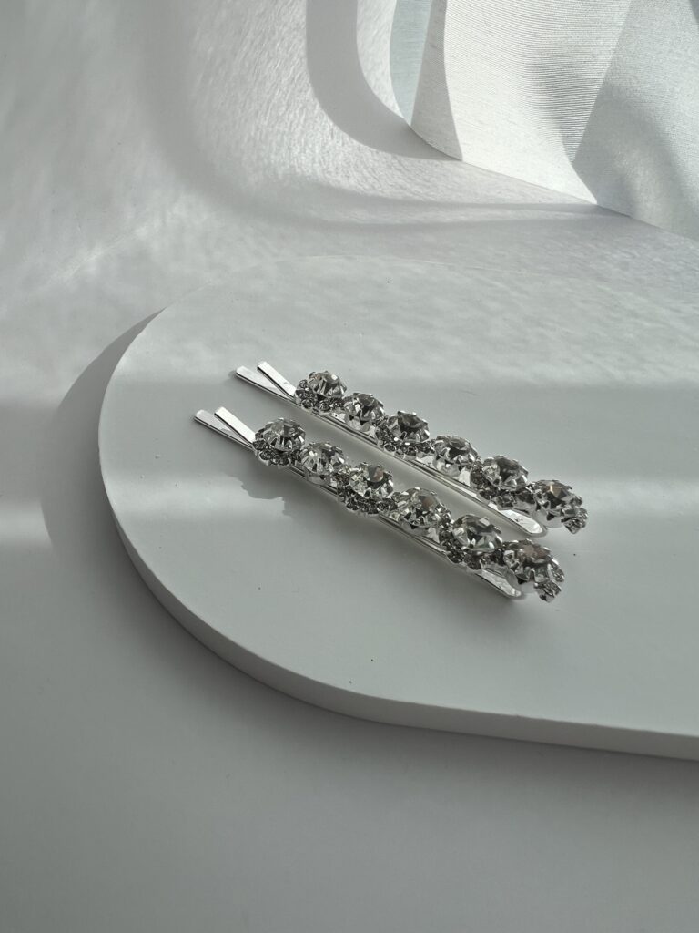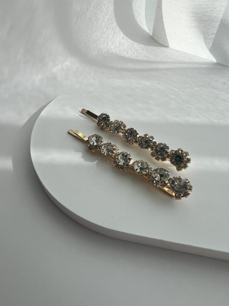 Metaliniai plaukų segtukai dekoruoti skaidriais akmenukais.