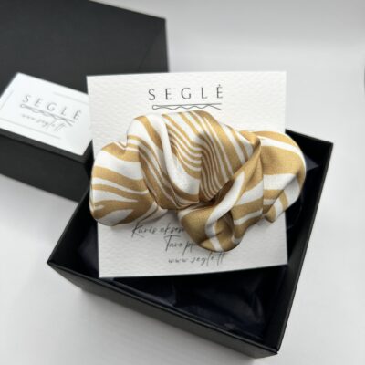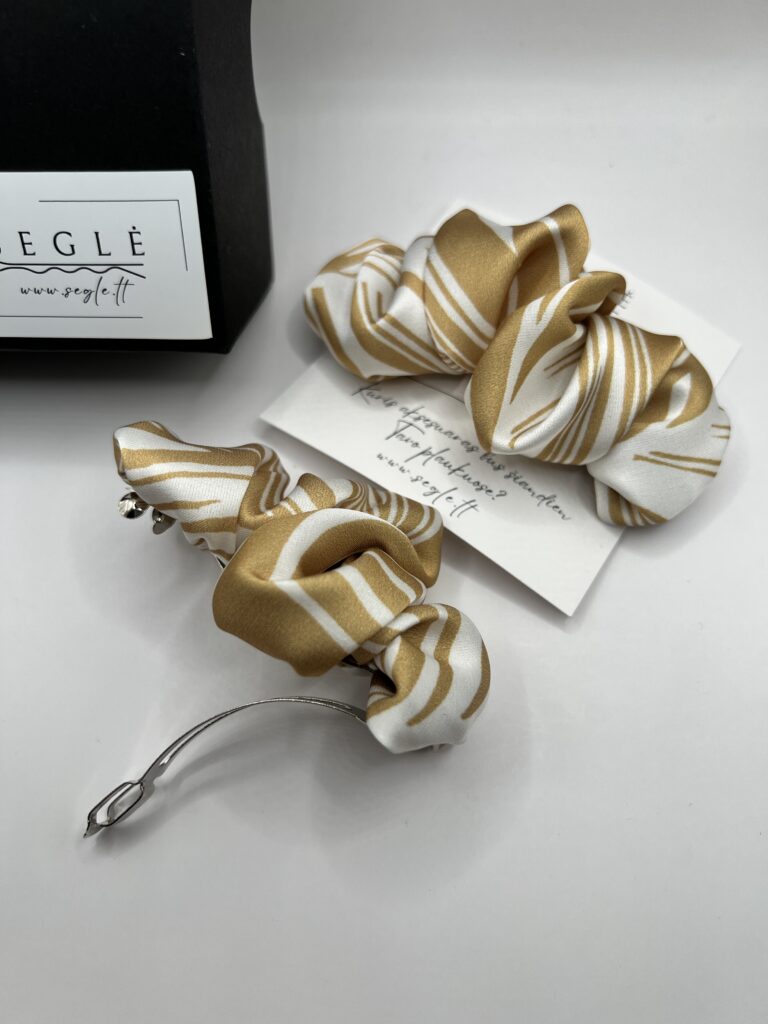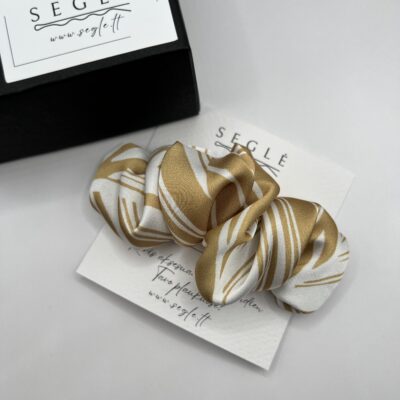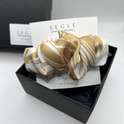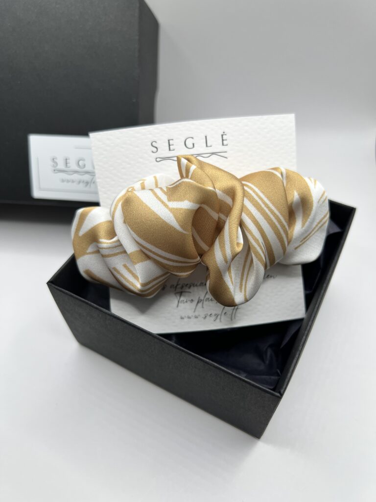 Rankų darbo plaukų segtukai – kruasanai. Segtukai pagaminti iš dirbtinio šilko, baltos ir auksinio smėlio spalvos.