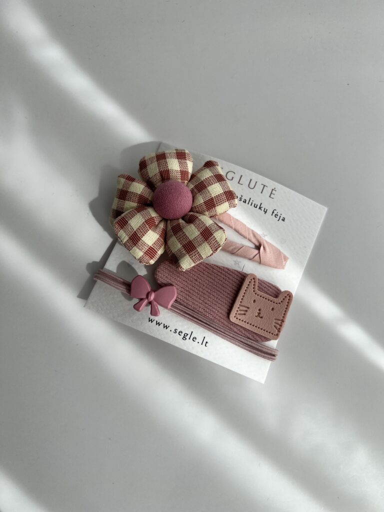 Rinkinyje rasite plaukų segtuką su languota gėle ir katyte, ir rausvą plaukų gumytę su kaspinėliu.