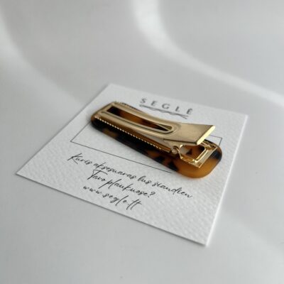 Plaukų segtukas metaliniu aukso spalvos aligatoriaus tipo susegimu. Segtuko paviršius tamsios karamelės spalvos su juodomis dėmelėmis.