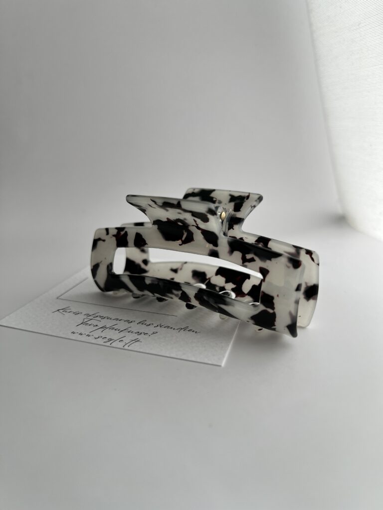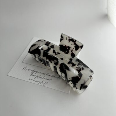 Juodos ir subtilios baltos spalvos plaukų segtukas žnyplės.