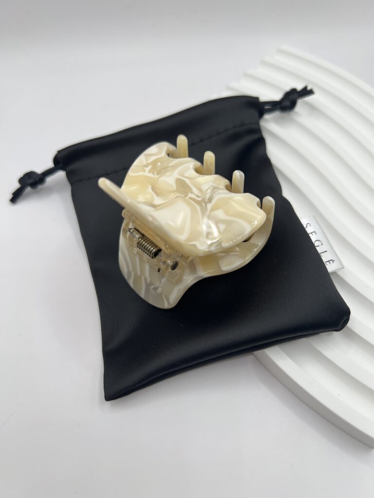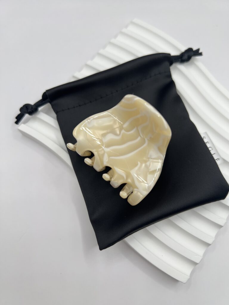 Subtilus, elegantiškas šviesių kreminių spalvų plaukų segtukas žnyplės.