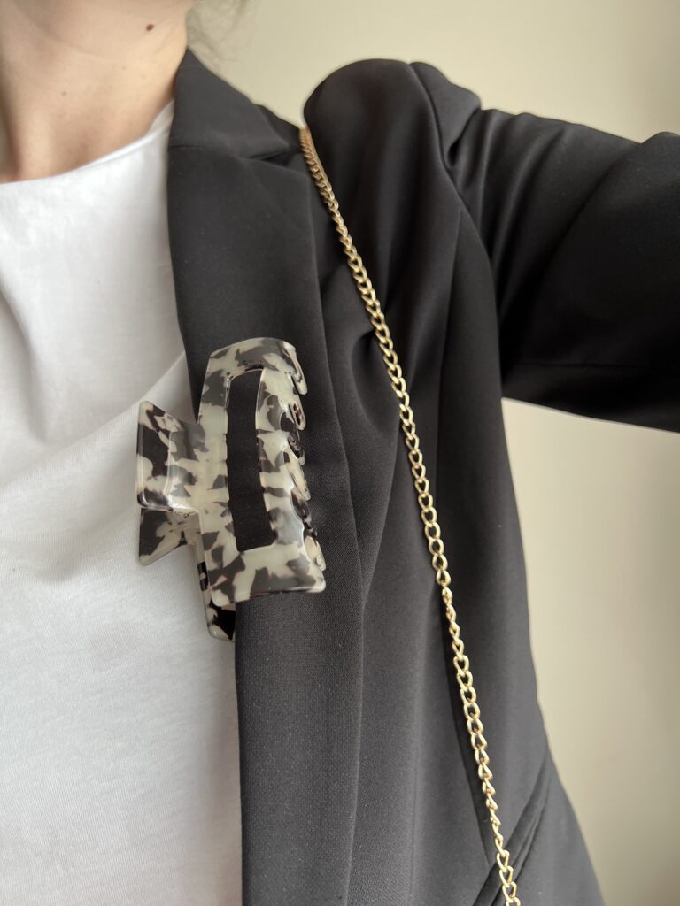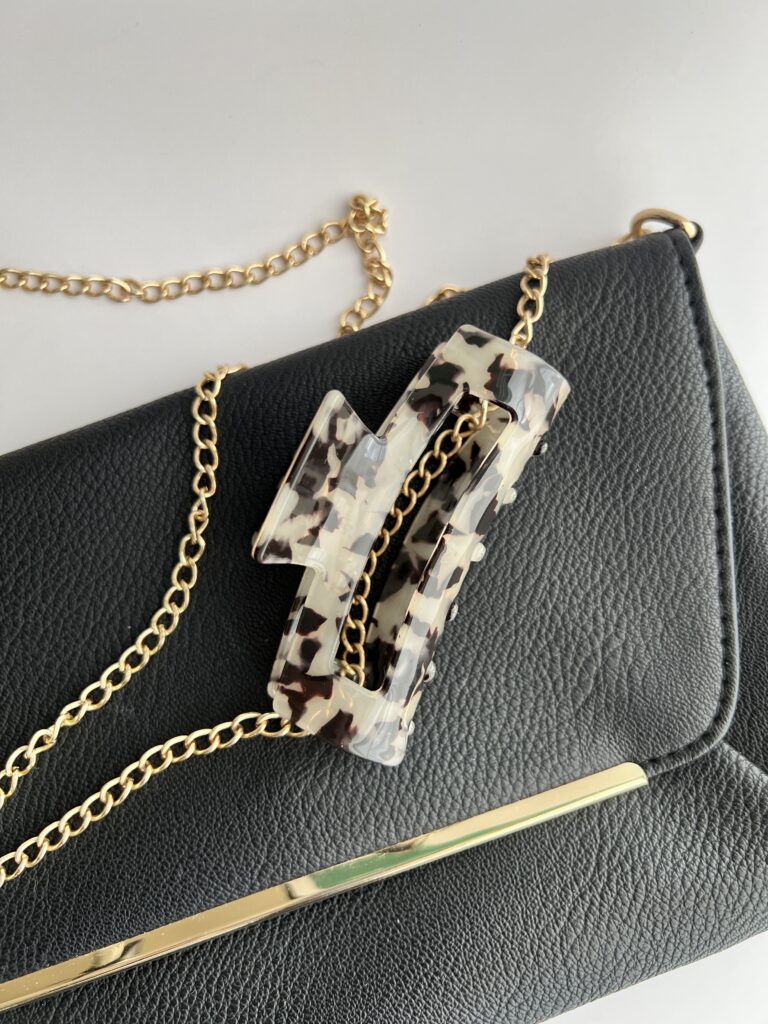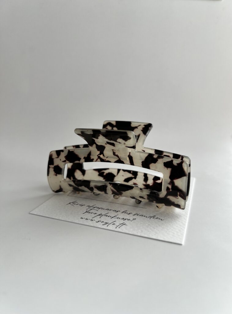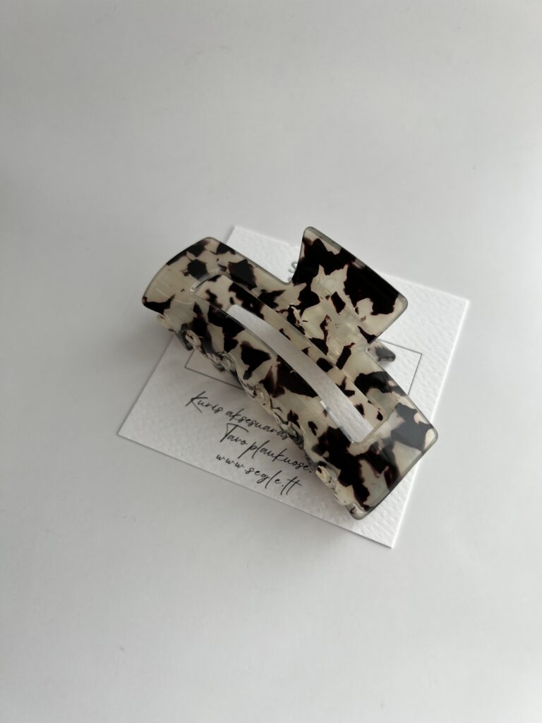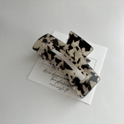 Juodos ir skaidrios kreminės spalvos plaukų segtukas žnyplės.