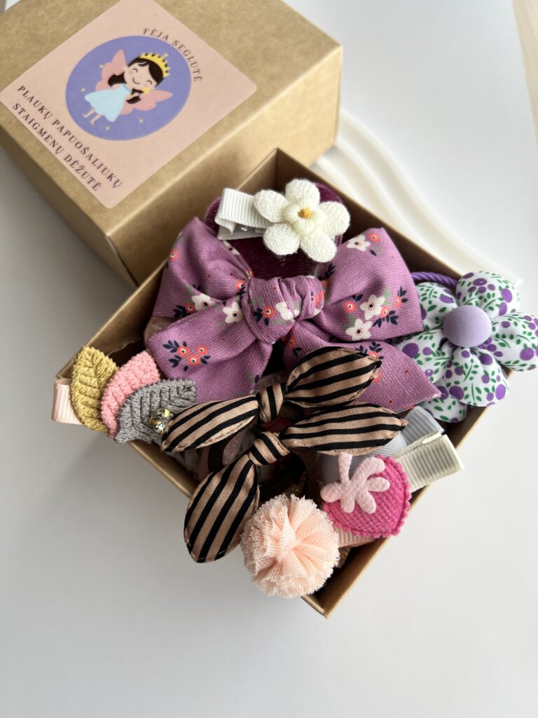 Plaukų segtukų ir gumyčių rinkinys mergaitėms. Aksesuarai rudoje dėžutėjePlaukų segtukų ir gumyčių rinkinys mergaitėms