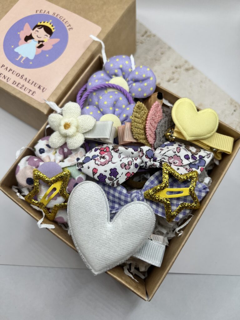 Aksesuarai supakuoti rudoje dėžutėje. Dėžutės ilgis ir plotis 9,5 cm., aukštis 5 cm.. Puiki dovana mažosioms. Tinka 3/4 metų mergaitėms.