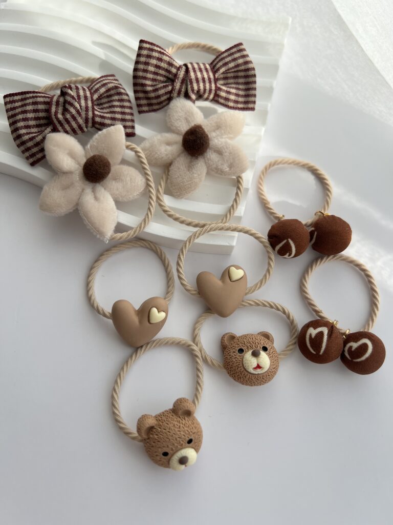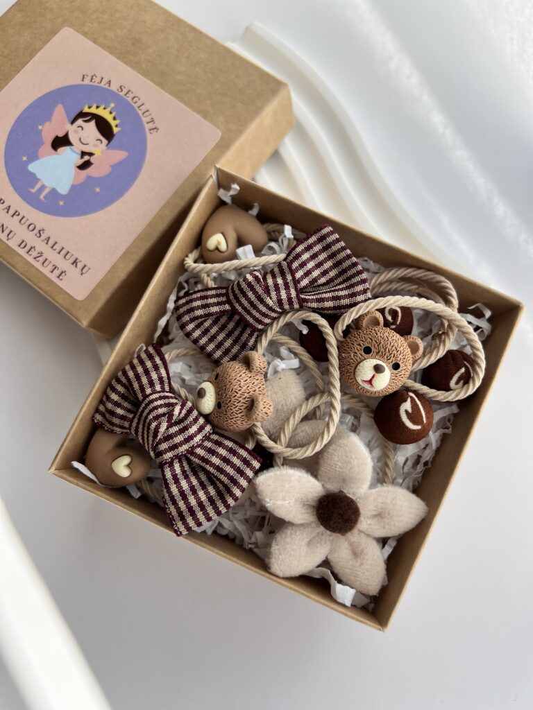 Rusvų spalvų plaukų gumyčių rinkinys mergaitėms. Gumytės rudoje dėžutėjePlaukų gumyčių rinkinys mergaitėms
