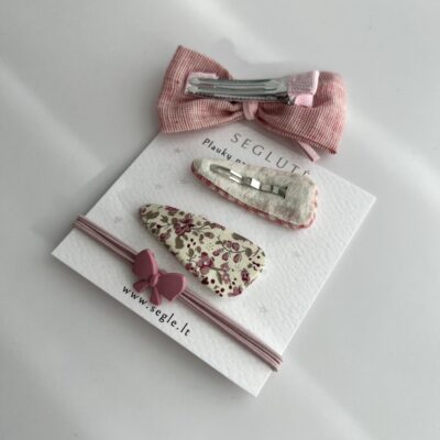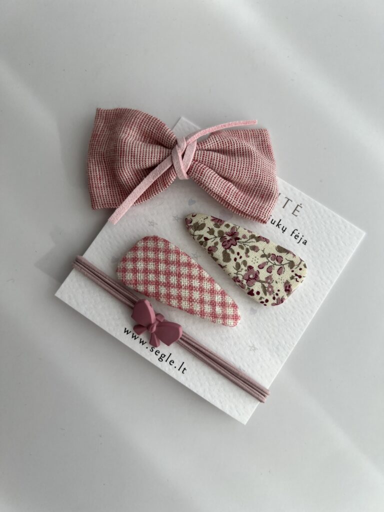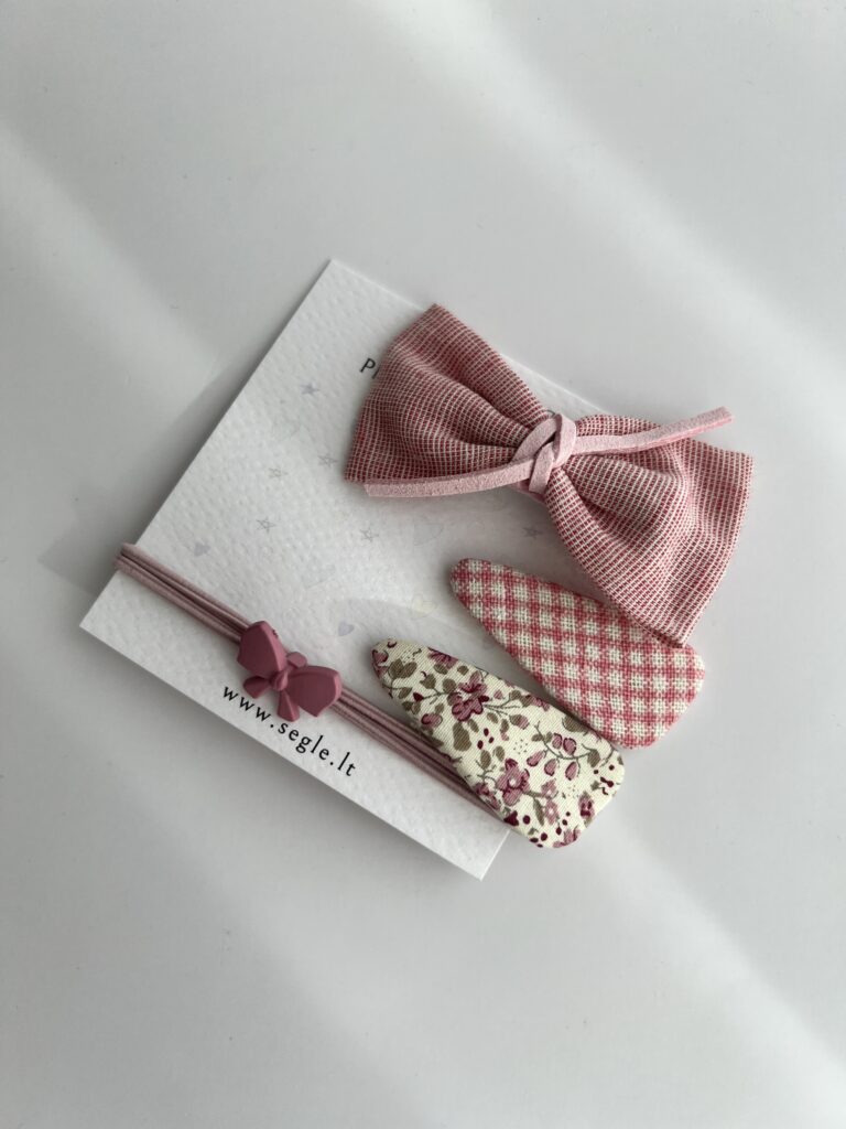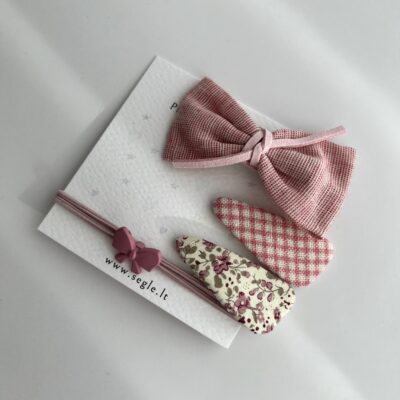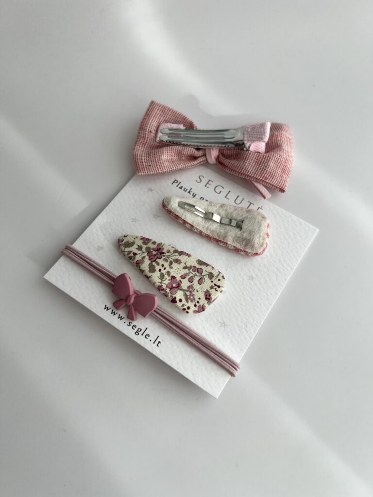 Rinkinyje rasite rausvą segtuką – kaspinėlį, du plaukų segtukus ir rausvą plaukų gumytę su kaspinėliu.