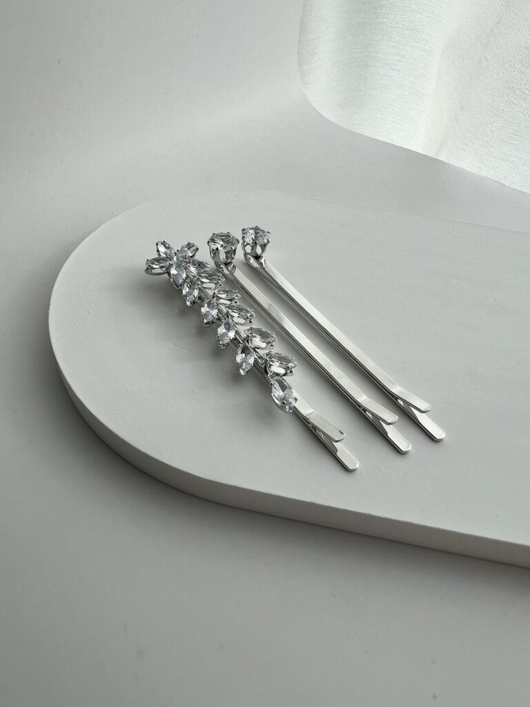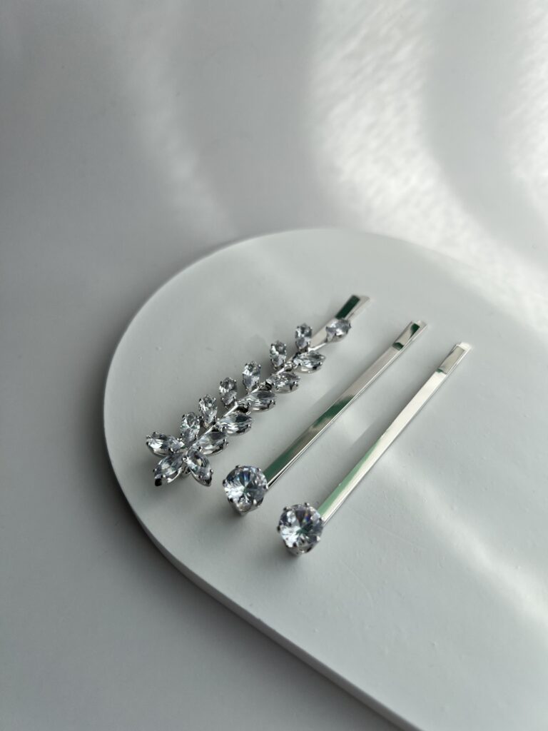 Metaliniai plaukų segtukai dekoruoti šviesą atspindinčiais cirkonio akmenukais.