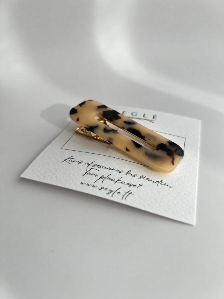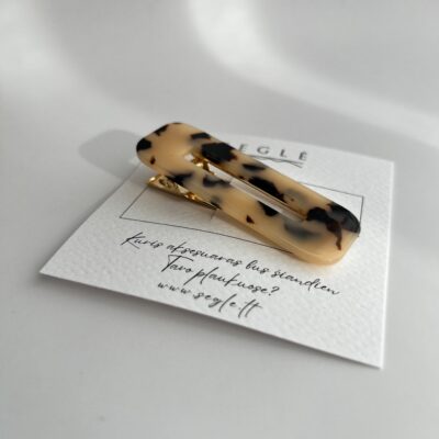 Plaukų segtukas metaliniu aukso spalvos aligatoriaus tipo susegimu. Segtuko paviršius švelnios rusvos spalvos su juodomis dėmelėmis detalėmis. Tokie plaukų segtukai tinka ilgiems ir trumpiems plaukams. Su šiuo segtuku galite susegti šonines plaukų sruogas, kirpčiukus ar sutvirtinti mažus plaukų kuodelius.
