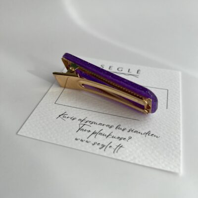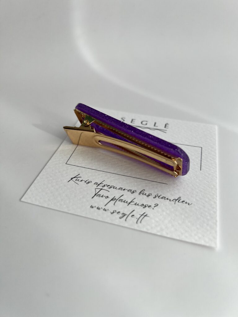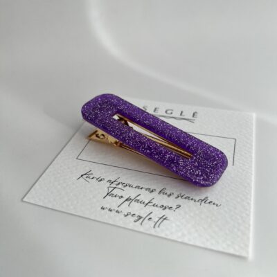 Plaukų segtukas metaliniu aukso spalvos aligatoriaus tipo susegimu. Segtuko paviršius tamsesnės violetinės spalvos su blizgučiu.