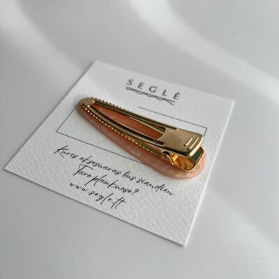 Plaukų segtukas metaliniu aukso spalvos aligatoriaus tipo susegimu. Segtuko paviršius švelnių rausvų spalvų. Tokie plaukų segtukai tinka ilgiems ir trumpiems plaukams, kai norima susegti dalį plaukų.