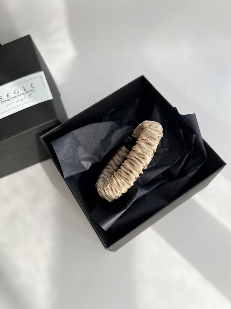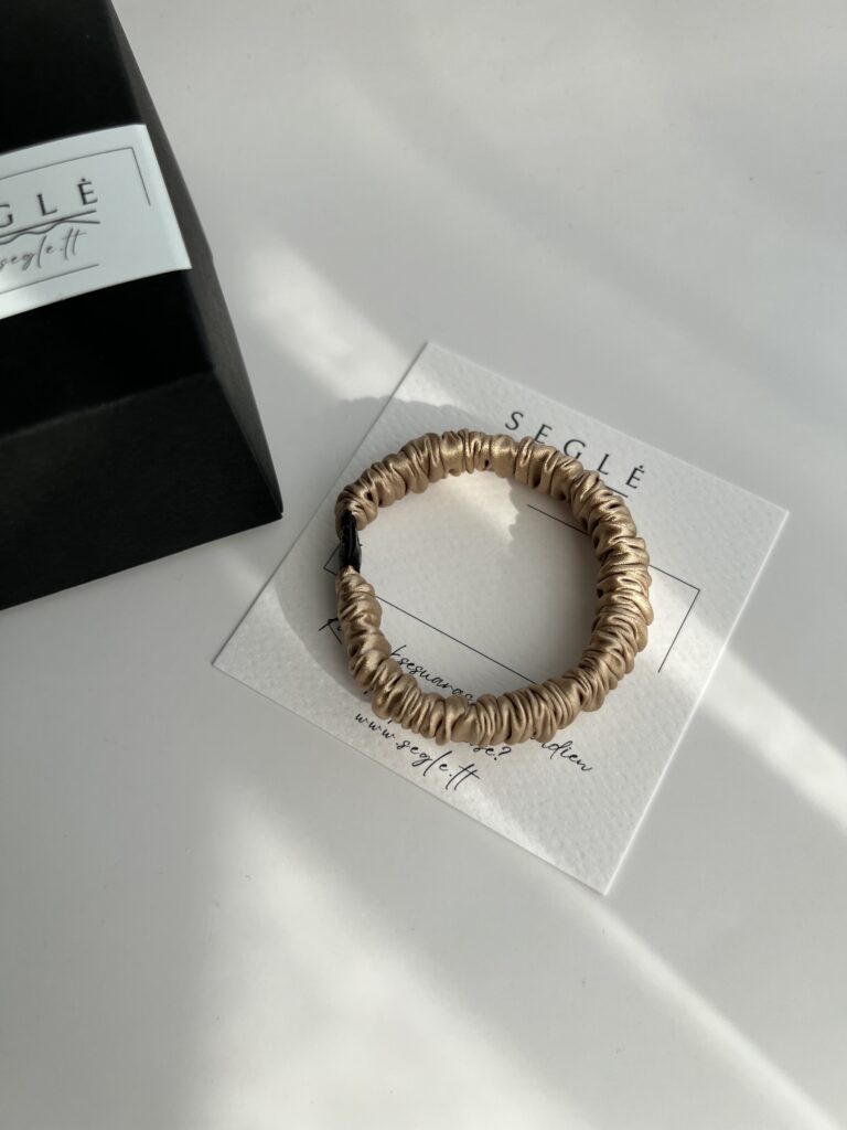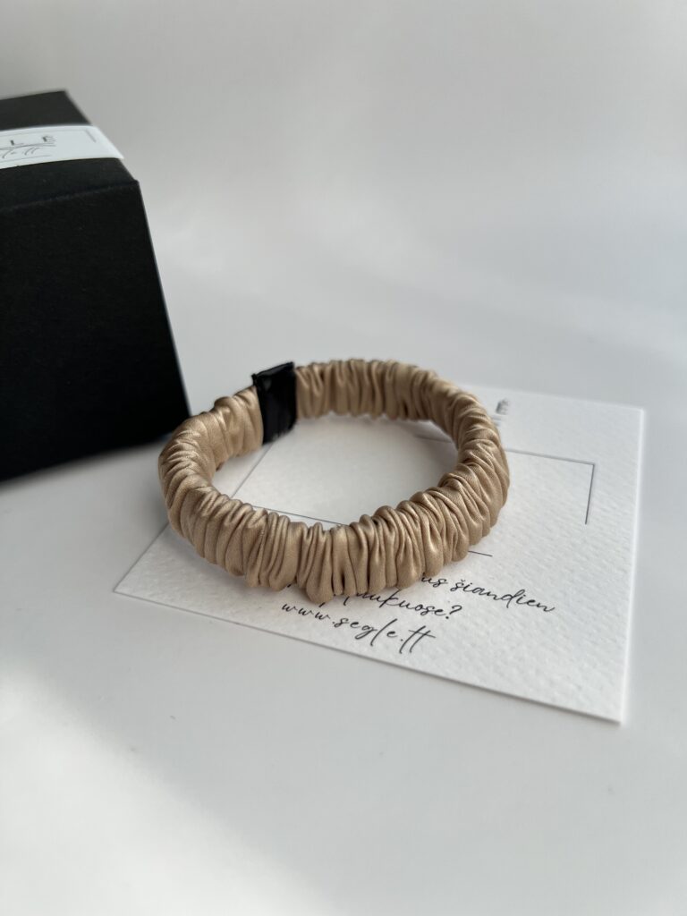Siaura natūralaus šilko plaukų gumytė, kuri tiks įvairaus storio plaukams. Gumytė šiltos spalvos – švytinčio šampano aukso atspalvis, su švelniu kreminės spalvos potoniu.