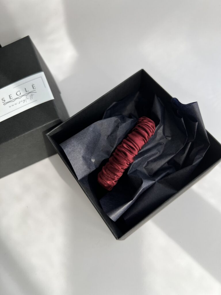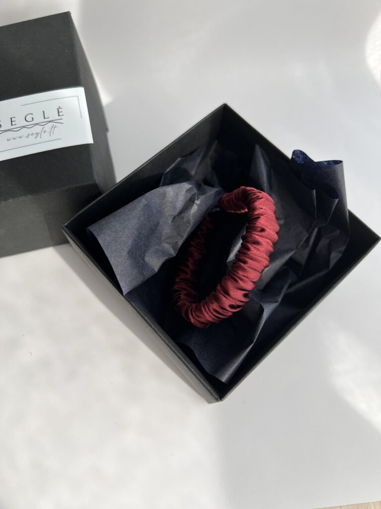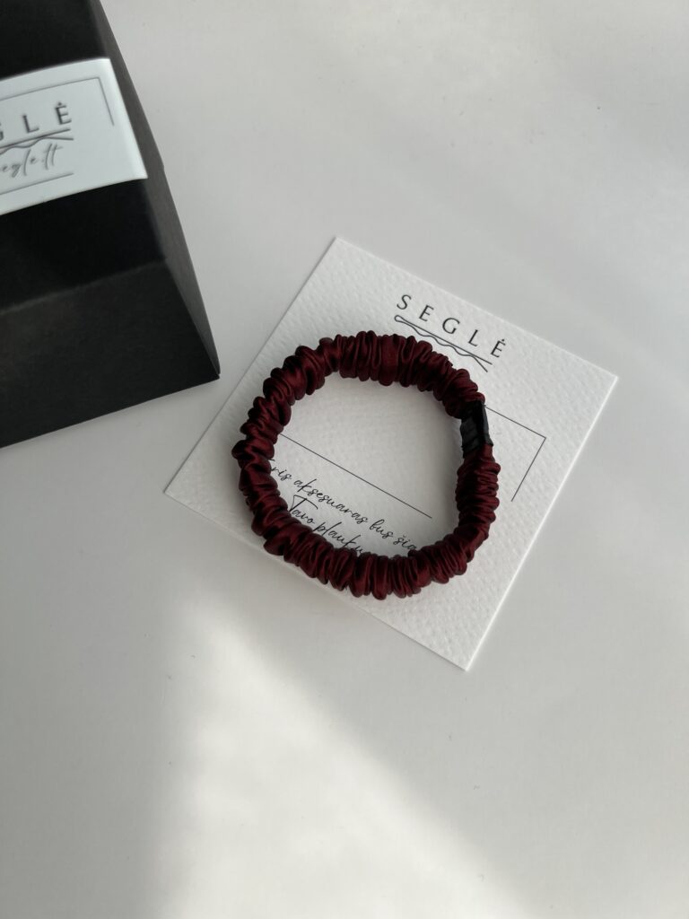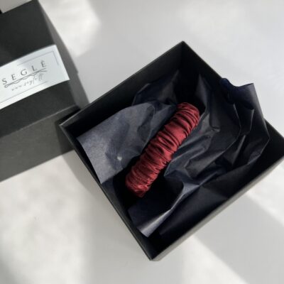 Siaura natūralaus šilko plaukų gumytė, kuri tiks įvairaus storio plaukams. Gumytė sodrios bordo/raudonos spalvos.