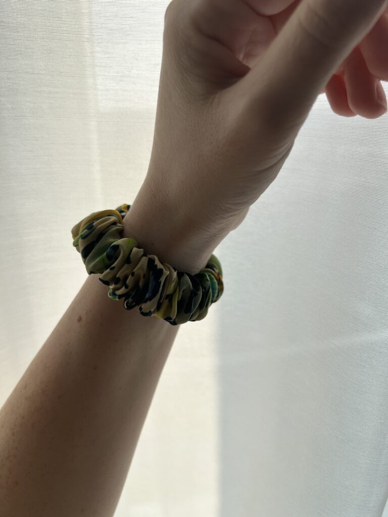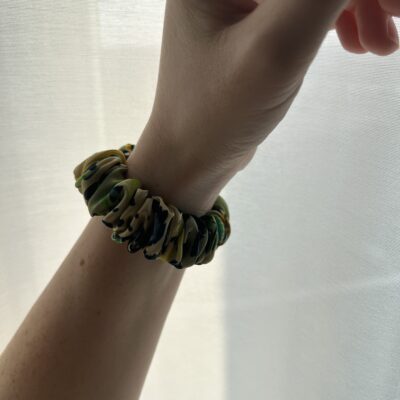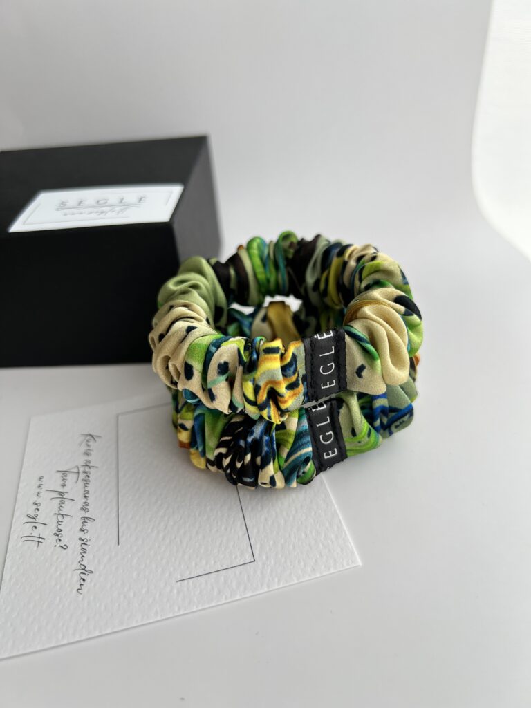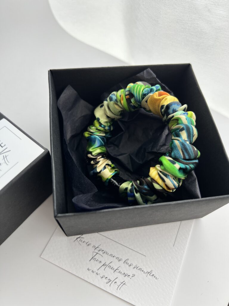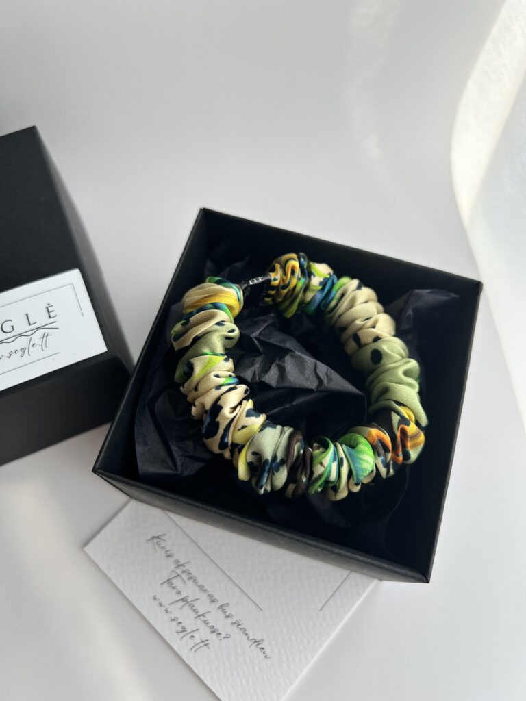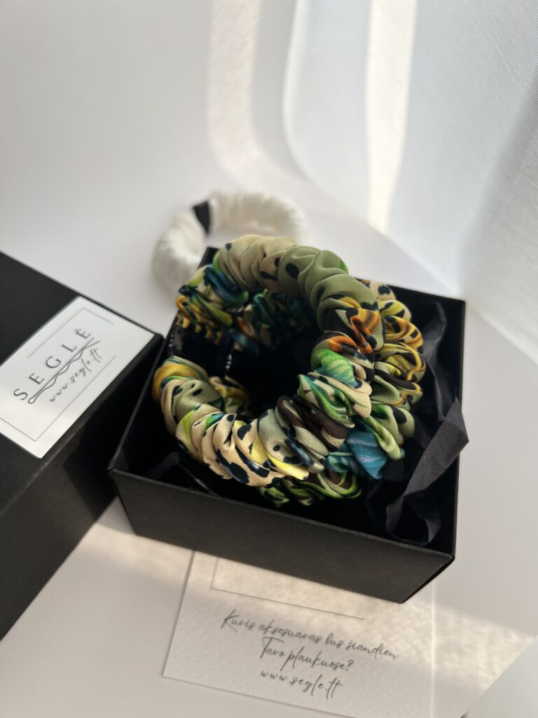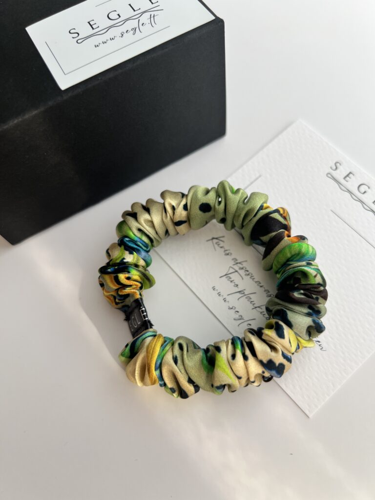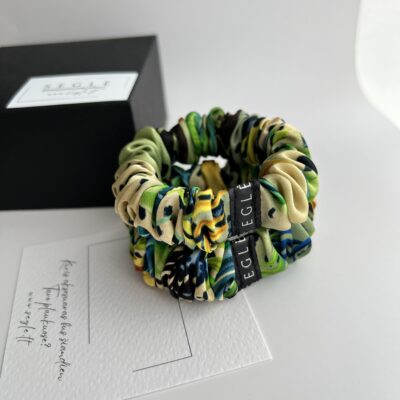 Vienetinės siauros rankų darbo plaukų gumytės „Jungle”, pagamintos iš spalvingo raštuoto kolekcinio natūralaus šilko.