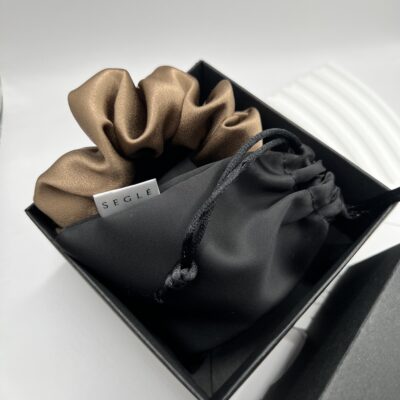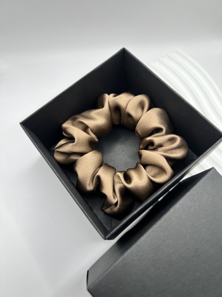 Pieniško šokolado spalvos šilkinė plaukų gumytė juodoje dėžutėjeŠilkinės plaukų gumytės ŠOKOLADAS