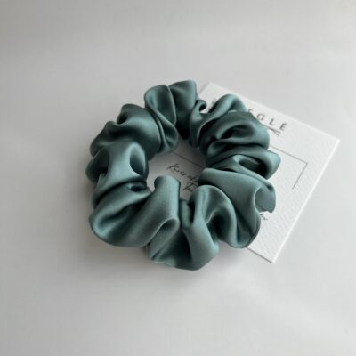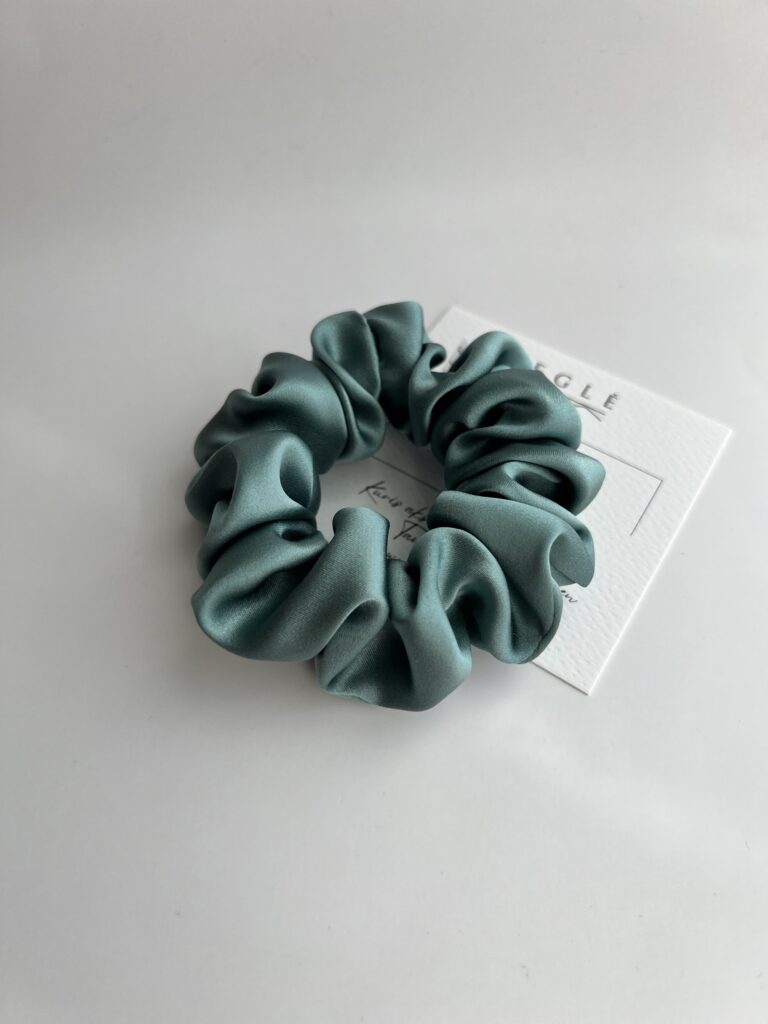 Mineralinės žalios spalvos natūralaus šilko plaukų gumytė. Plaukų gumytė didesnė. Gumytė baltame fone, šalia juodos dėžutėsŠilkinės plaukų gumytės PISTACIJŲ ŠALTA KAVA