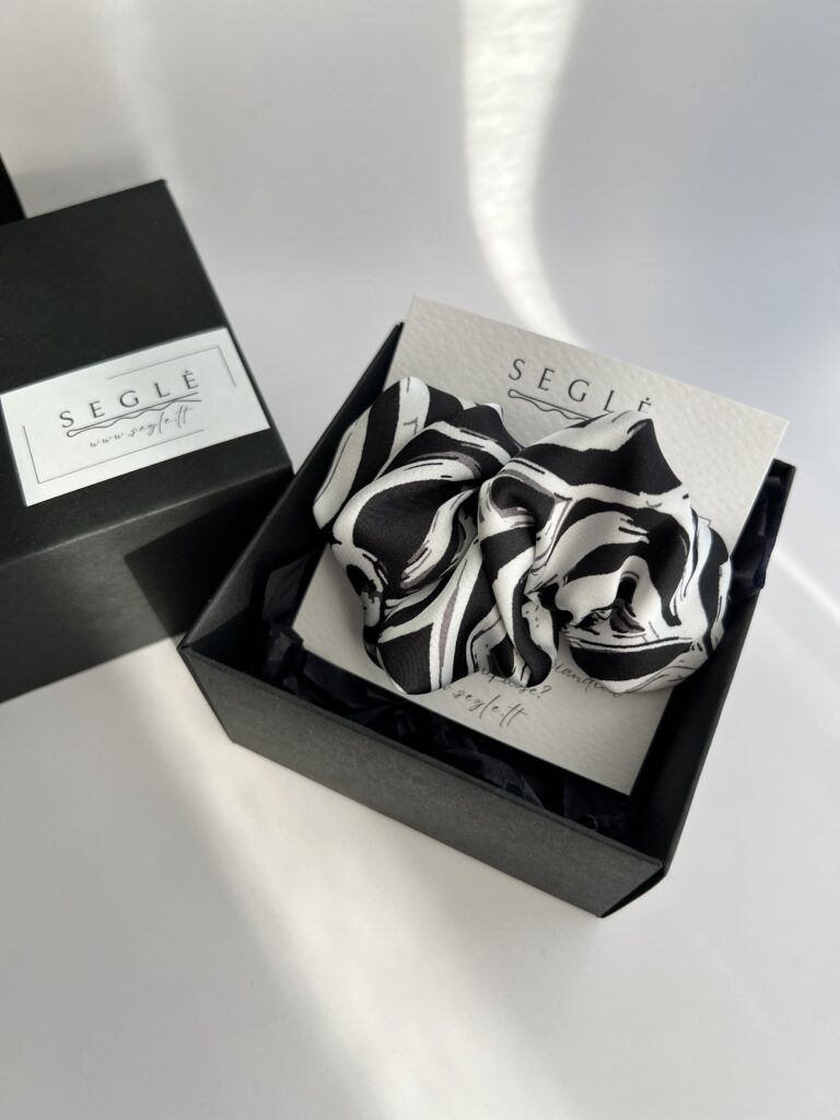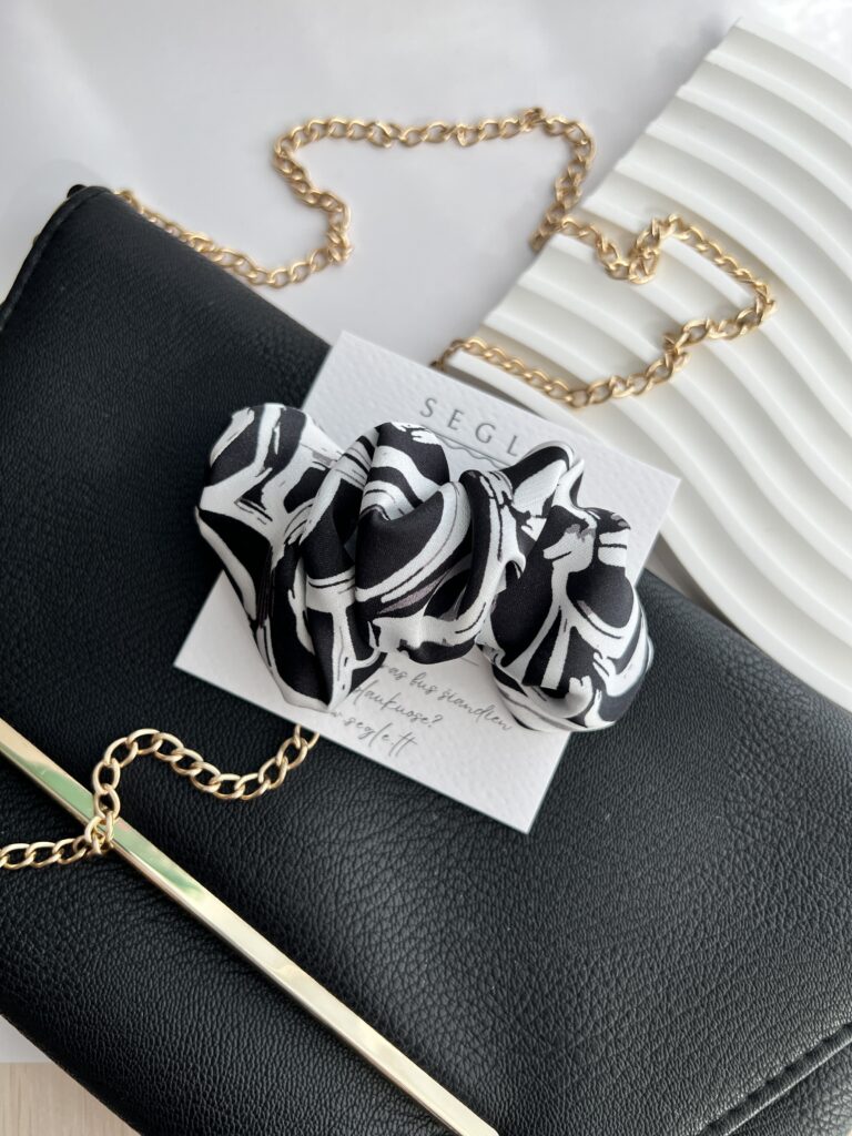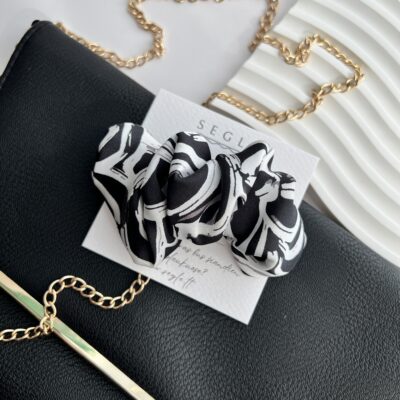Rankų darbo plaukų segtukai pagaminti iš dirbtinio šilko audinio, juodos ir baltos spalvos.