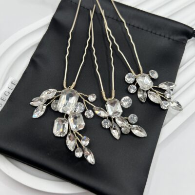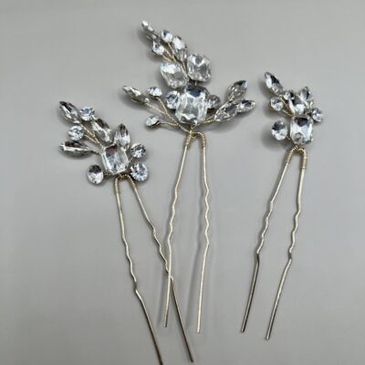 Metaliniai plaukų smeigtukai kuodui dekoruoti skaidriais akmenukais.